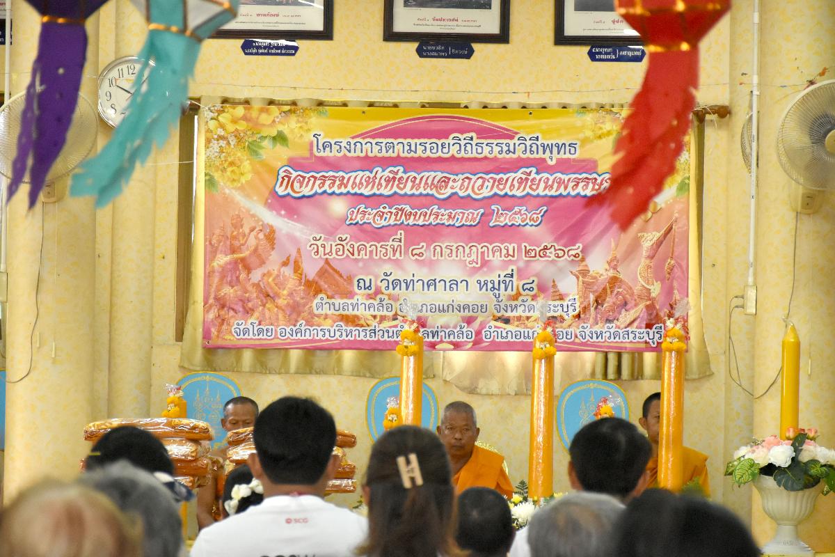 กองการศึกษา ศาสนา และวัฒนธรรม องค์การบริหารส่วนตำบลท่าคล้อ โดยนายทนงยุทธ จันทกูล นายกองค์การบริหารส่วนตำบลท่าคล้อ ได้จัดโครงการตามรอยวิถีธรรมวิถีพุทธ (กิจกรรมถวายเทียนพรรษา) ประจำปี 2568 ณ วัดท่าศาลา เพื่อถวายเทียนพรรษา ผ้าไตร สังฆทาน และปัจจัย ให้แก่วัด และสำนักสงฆ์ภายในตำบลท่าคล้อ